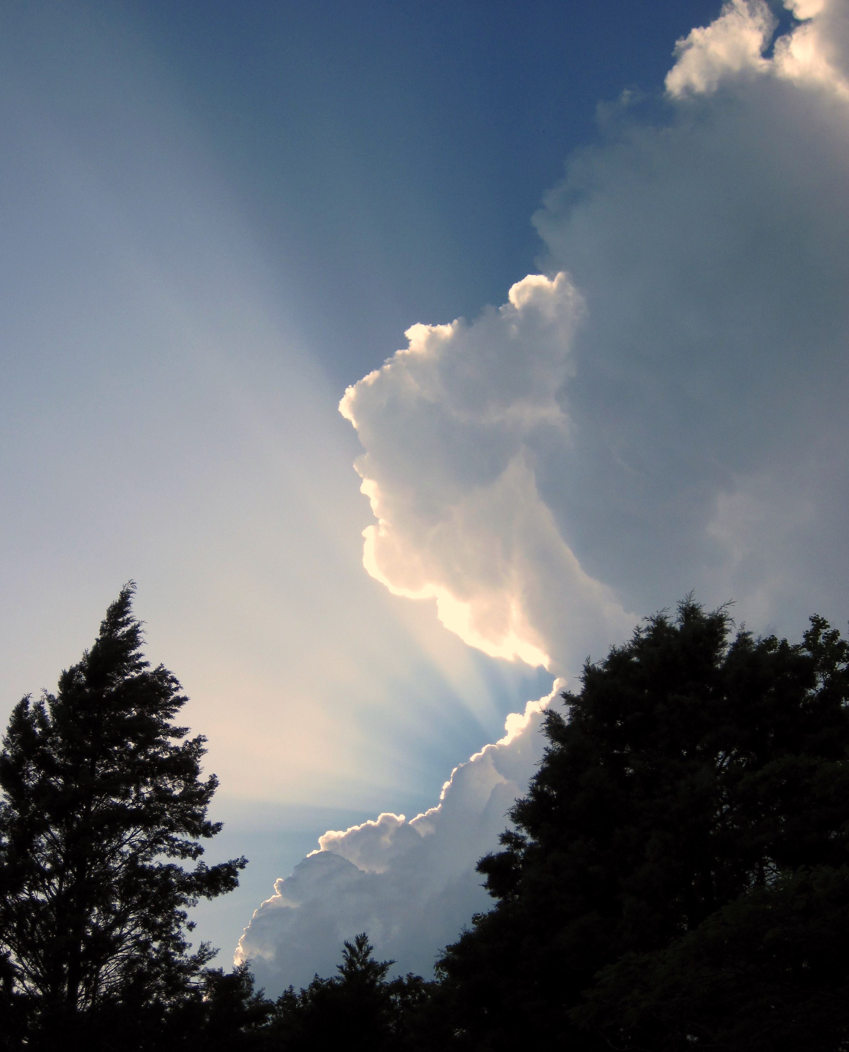 It has been very humid for the last few days… getting ready for a front to blow through tonight. Right around sunset this evening the clouds started building up into thunderheads ahead of the front. This is a shot of the sunlight from the setting sun coming from behind one of the clouds. We didn’t get too much rain, but got a nice lightning show after dark.