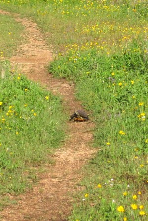 Noreen and I went on a walk today through the greenbelt and to the nearby park. Along the way we came across this turtle. Seems he was taking the path of least resistance.