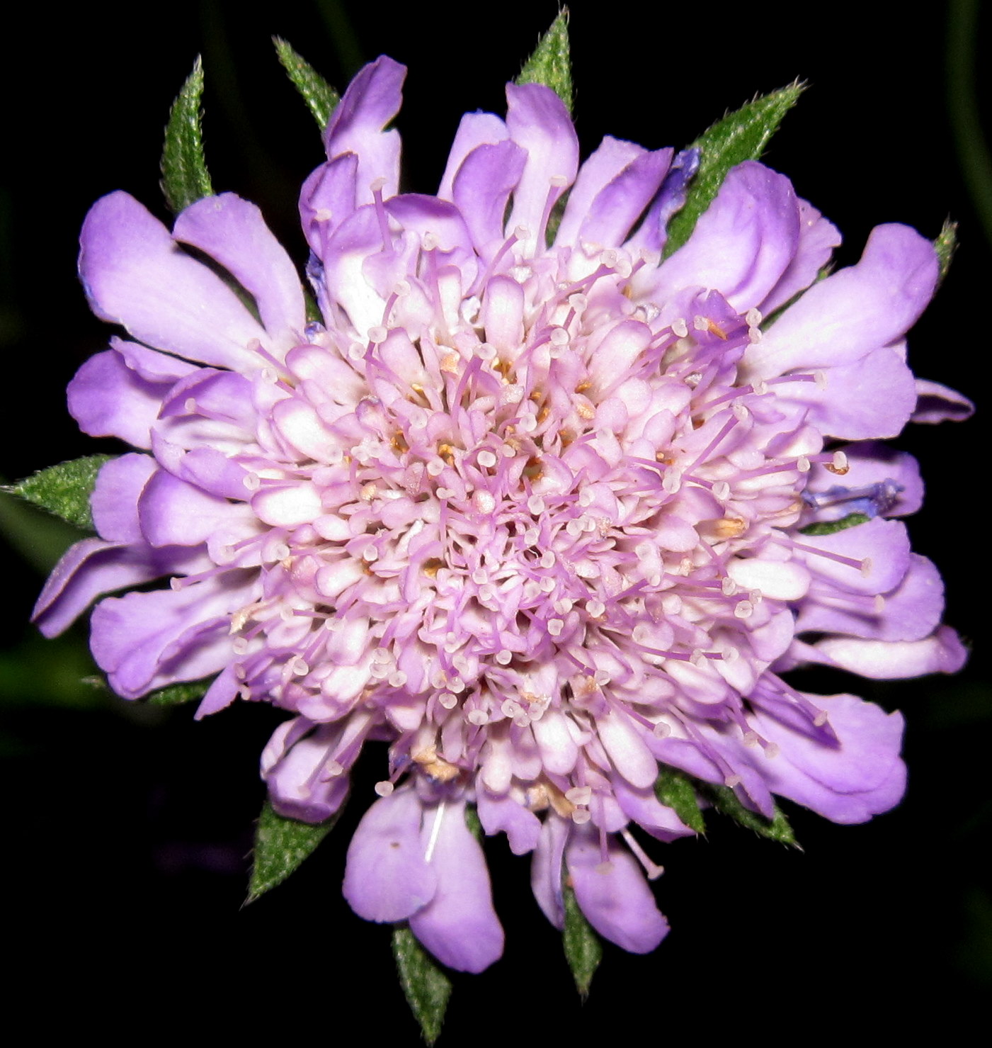 After dinner tonight I went out to the newly planted garden and, though it was dark, got this shot of a pincushion flower. I like how it looks like it is floating against a black background.