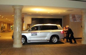 A Toyota being pushed through the lobby of the Houston Omni Hotel. Today is the Friday before the MS-150 bike ride weekend, which is a 2 day bike ride from Houston to Austin, raising money for fighting Multiple Sclerosis. For the last 8 years or so I’ve been driving my cycling friends to the event in Houston, helping them with their gear and driving their truck back to Austin the next day. I call it being a “sherpa.” It’s alot of fun with my girlfriends, and a great deal – as they treat me to a wonderful dinner.