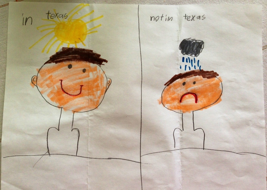 Aaron came down to Austin for a visit about a year ago. He is lobbying heavily with his mom and dad to come down again soon. This is a picture he drew that he showed me exactly 3 seconds after I walked through the door today. 🙂