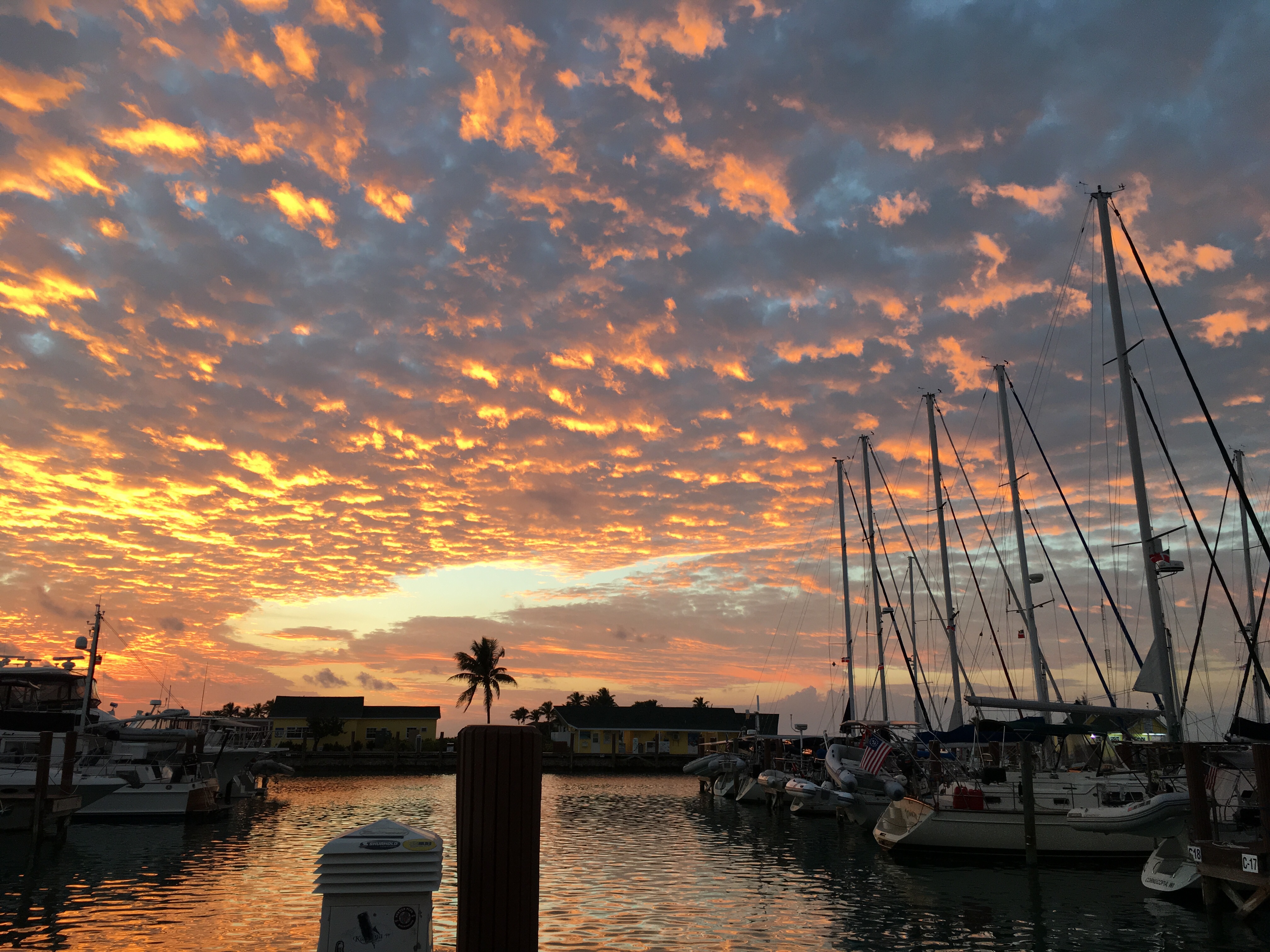 We arrived on time, at the right place, and pulled into our slip at the Old Bahama Bay Marina. We hoisted the yellow quarantine flag until Capt. Lori went ashore to clear in the crew. We skipped the big game but enjoyed our fill of conch and island drinks, which was my real superbowl. Sunset at the marina…
