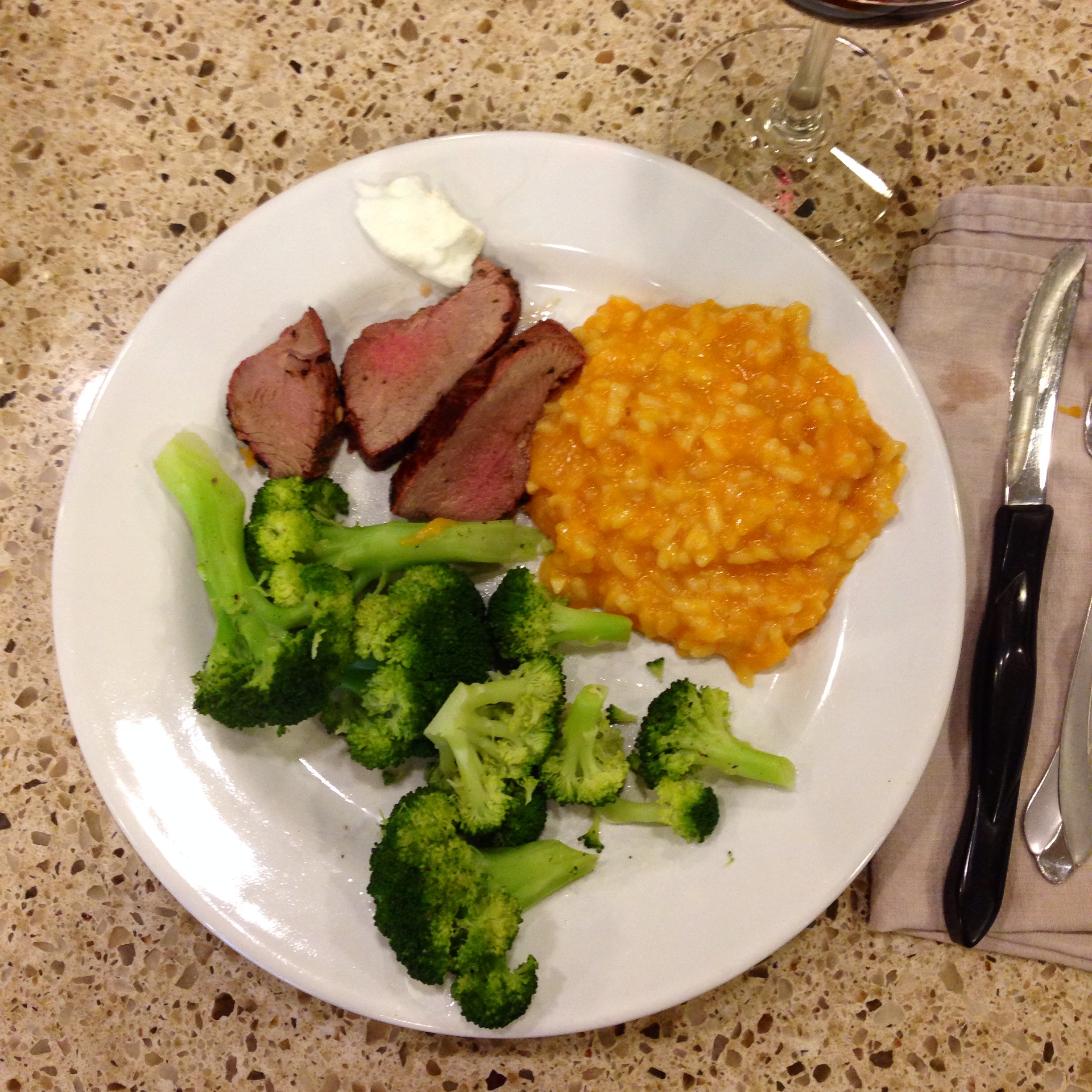 I can’t help it. Perfectly grilled leg of lamb. Roasted butternut squash risotto. Steamed broccoli. A lovely cab. Monte did all the work. And it was delicious.