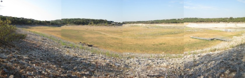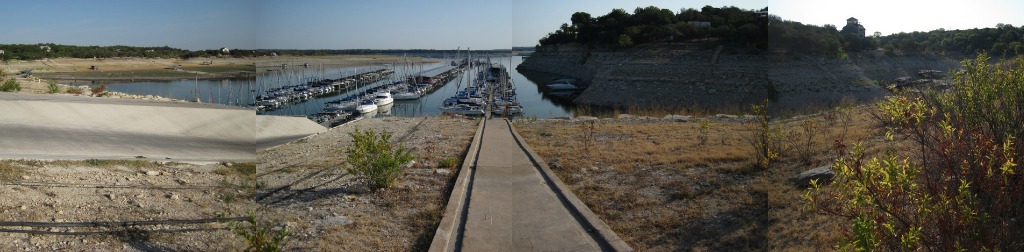 The lake is at 632 and change – 3 feet from the low of 2 years ago, which will surely be surpassed. It’s sad to see the pasture out back that Hurst Cove south has become. This (poorly stitched together) panorama shows the view off the back of the marina looking towards Lakeway Park. Across the way you can see Hurst Harbor Marina (on land). All their boats have been moved across the lake long ago. Also missing is Johnny Finn’s floating restaurant that has been moved again to the mouth of the cove.