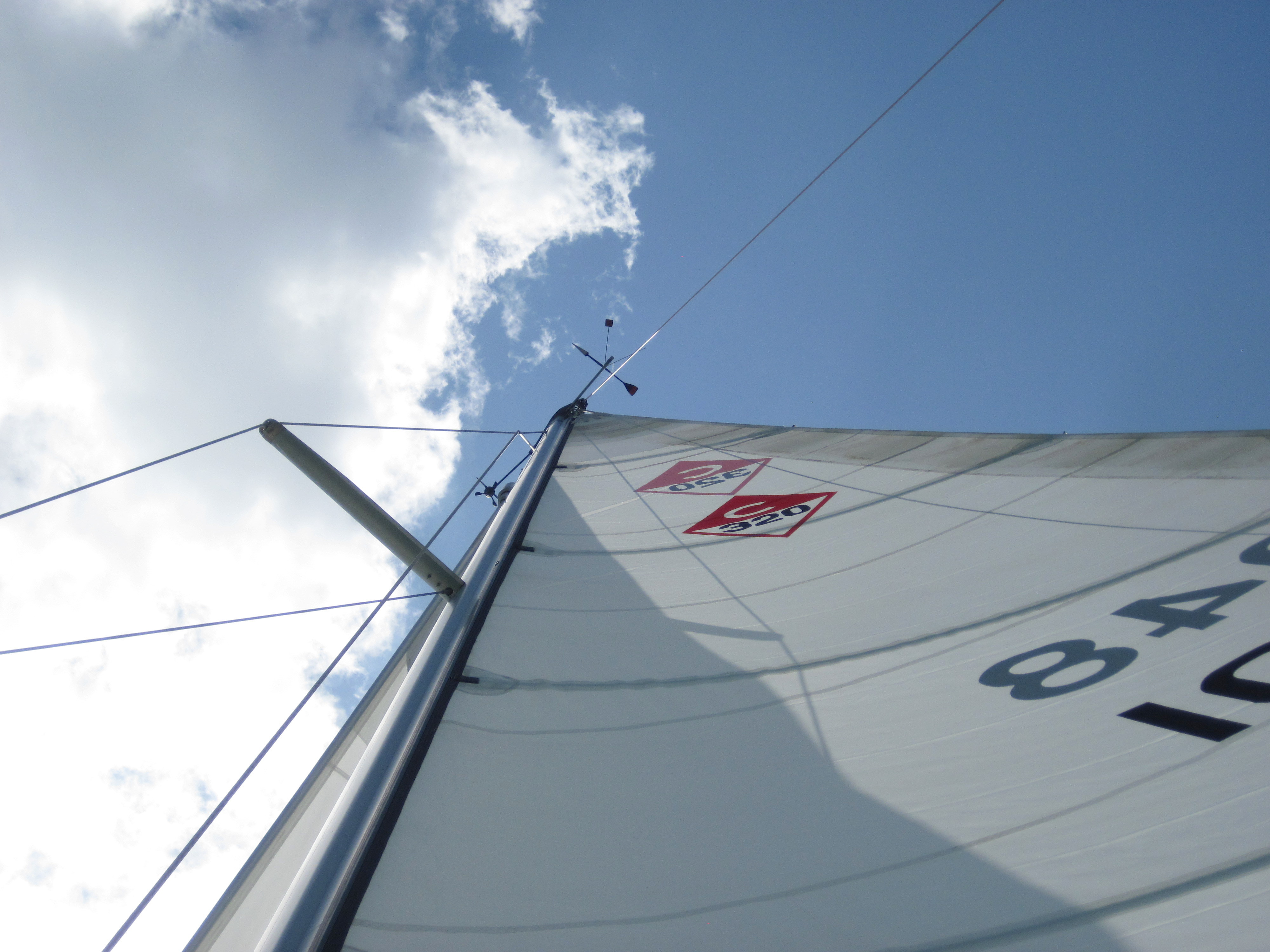Julie and Ryan recently acquired a new-to-them sailboat. It’s an older Catalina 25. It needs some work, so we are helping them get things fixed up. Clever Monte got the outboard motor working. Now he is helping Ryan repair the electrics on-board. Julie brought over the sails, which need some mending. Their mainsail will be my next sail project. It’s in pretty good shape, except where sun damage caused some tears and deterioration where the previous owner left parts of the sail exposed.