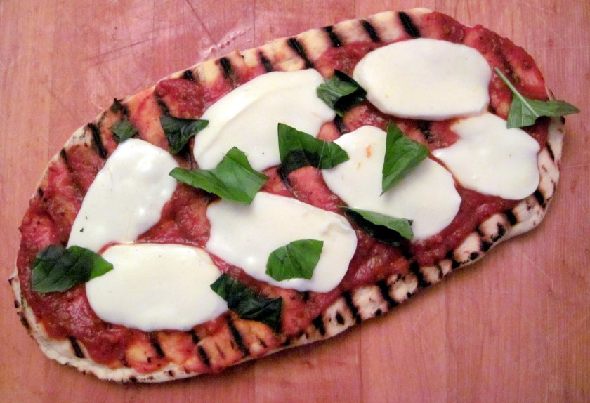 This time, he had something else in mind. We have a charcoal hibachi grill out back as well. This time he put one of our cast iron grill plates on the hibachi, and put the pizza dough on top of that. After turning it the dough once, he put sauce and cheese on top while the other side was grilling. It only took a few minutes per side – and it turned out great.