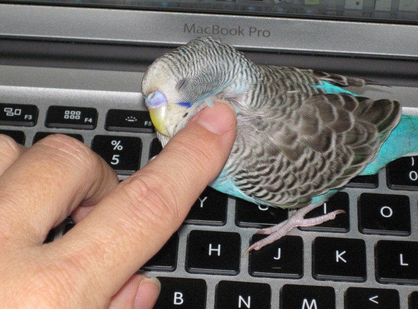 It is not my intent to post lots of pictures of our bird, but I couldn’t help this one. Keeto likes to walk around my desk, investigating everything. He makes frequent trips to the keyboard to get his head scratched. What a sweet bird 🙂