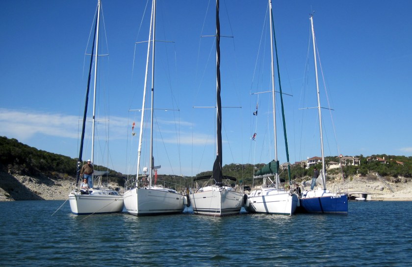 Let me see if I can do roll call….left to right, we had Mark & Sarah on Serenade, Gray & Debbie on the blue hulled First, Bartlett’s parents’ Catalina, John & Claudia & 2 others on the brand new Solace, Tasha & Robert and Tony & Michelle (visiting for the weekend!) on Voodoo, Danny & Casey on the Beneteau 31, Rory & Greg on Sapphire, Camden & Terry on MoonRock, Kurt, Wally & Kevin on Dancer, John & Deanna on Caribbean Run, Mike on Allegro, Lori & Dave on Camelot, Monte & me on Cupholder, and last but not least, Joe on Prelude. Whew!