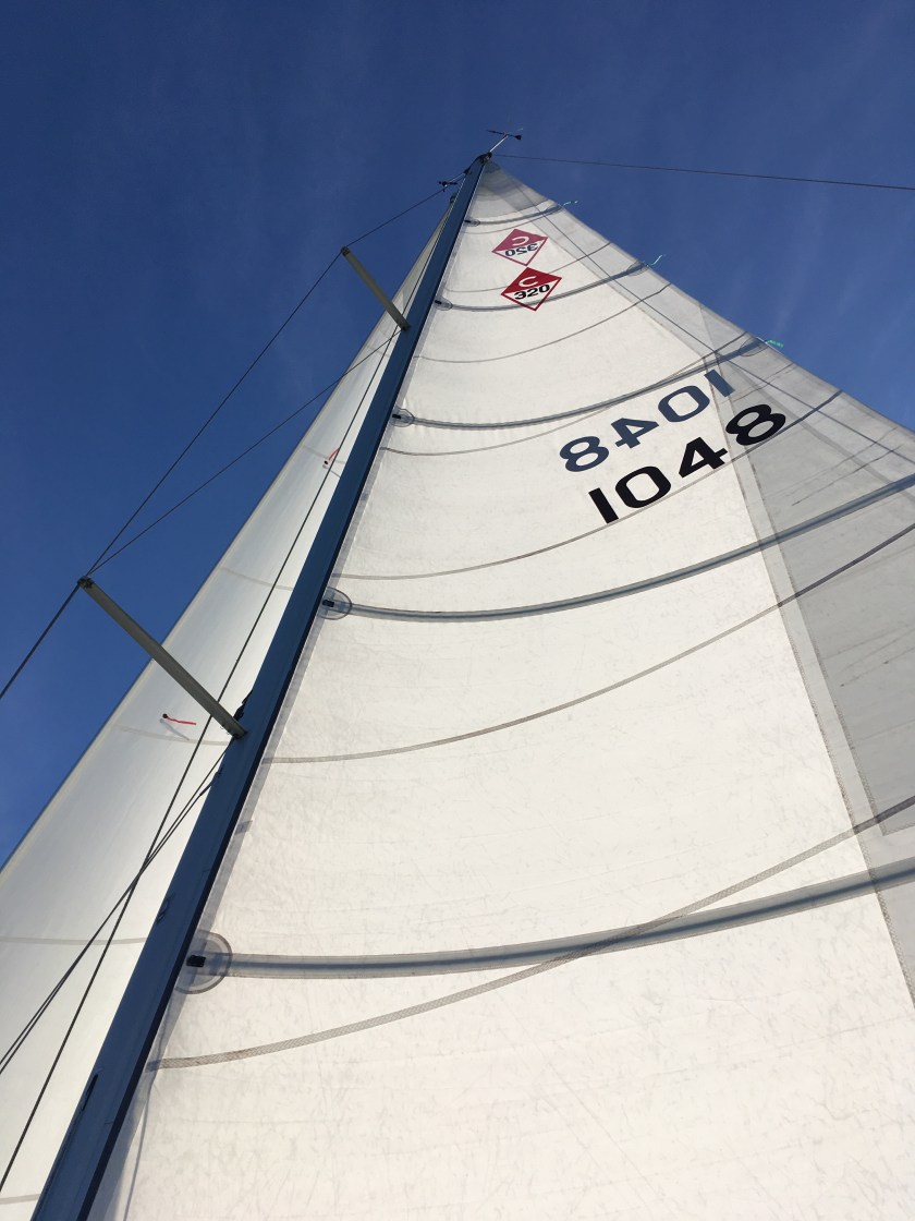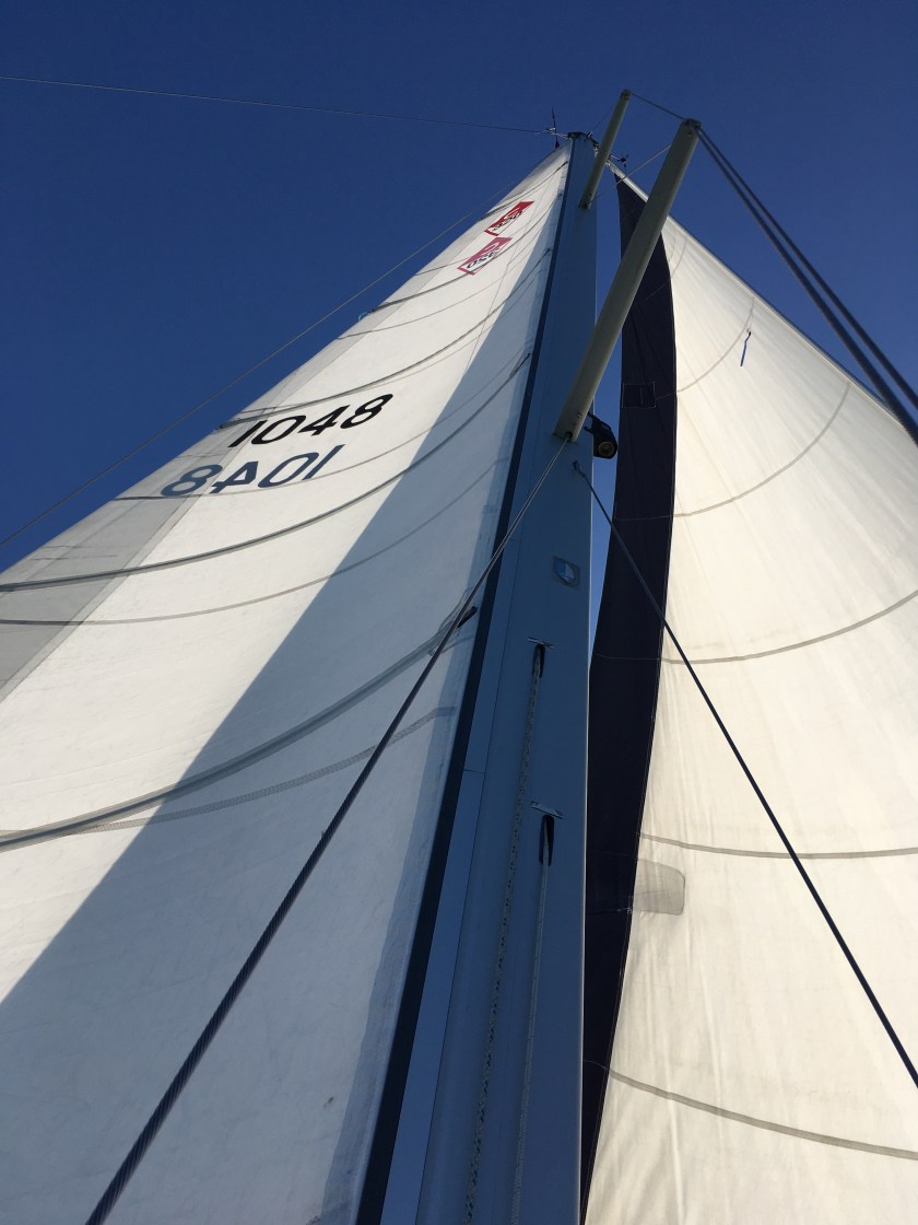 Okay, I’m a tiny bit ecstatic. I finished the mainsail repairs today. And the slow, endless rain of the last week or so has moved on. So we drove out to the marina and tied the main back on, then took Nirvana out for a sail for the first time in about 3 months. We hoisted both the main and the jib. It was the first time taking Nirvana out since I repaired each of the sails. The winds were light, but I loved seeing them out and in the wind.