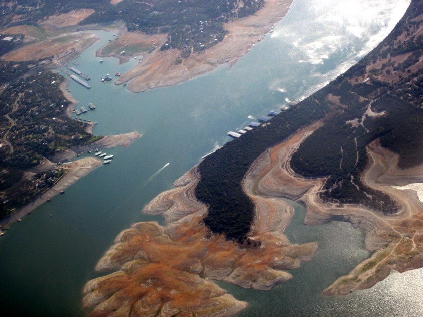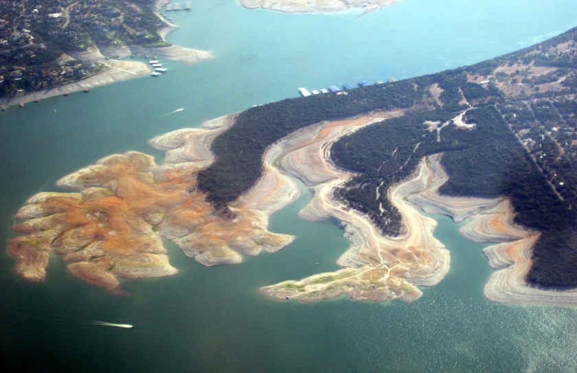 We’re back home.  We had a nice time in the Pacific NW, but it’s nice to be home again.  We flew in over Lake Travis and got these pics.  The lake is at 629.07′ today, according to LCRA.  We are lower now than we were in 2009, and only about 15′ more to go to hit the all time low.  The shot above is of Hurst Cove and our marina.  You can see the docks all stacked up.  The marina sent a notice saying they’ll be moving some of the docks out to the middle of the cove.  Not much water left in there.