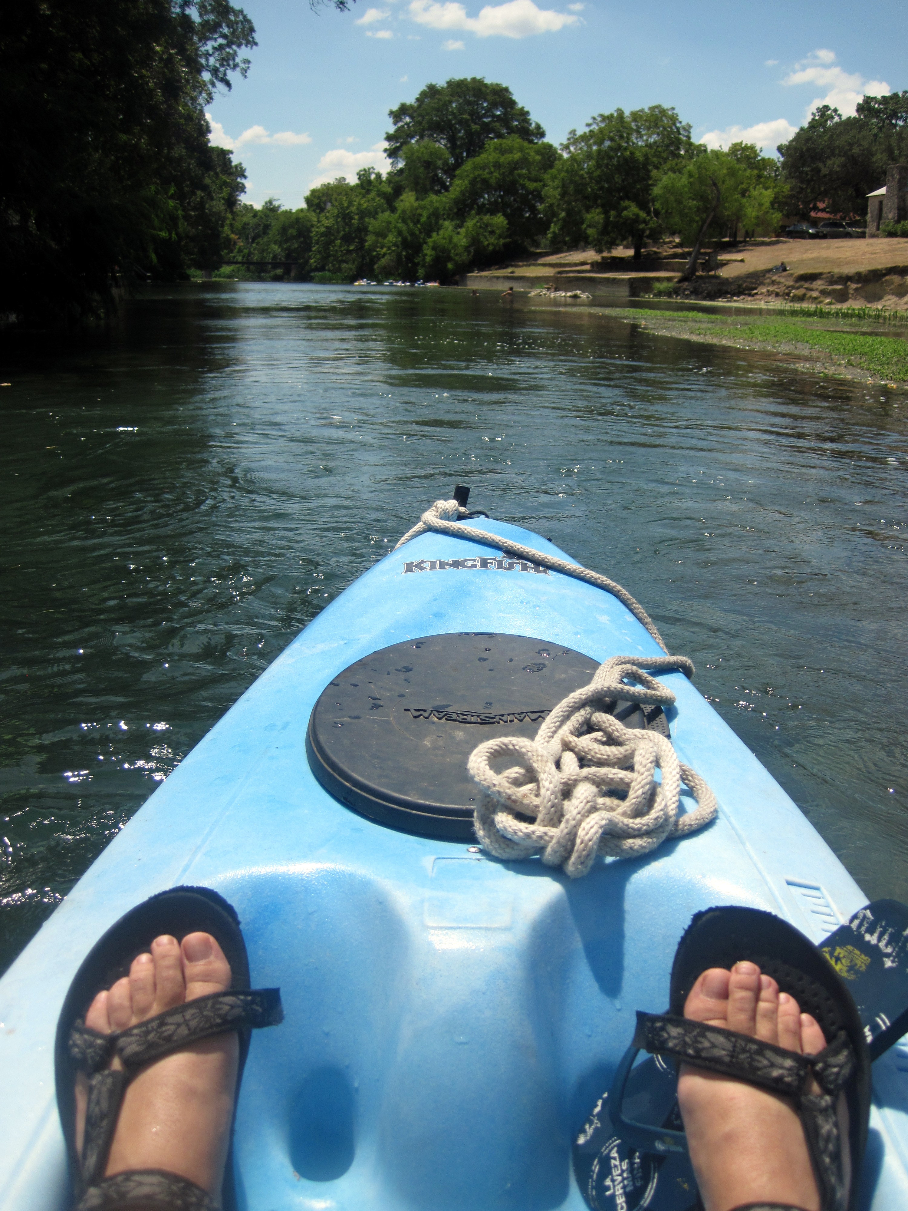 The San Marcos is a spring-fed river, and even though we are in a severe drought, it continues to flow with crystal clear, cool water. We put in at City Park here, and first paddled upstream as far as we could go. Then we paddled down stream to the Lion’s Club take-out point and took our kayaks over the 3 rapids there and went a little farther downstream.