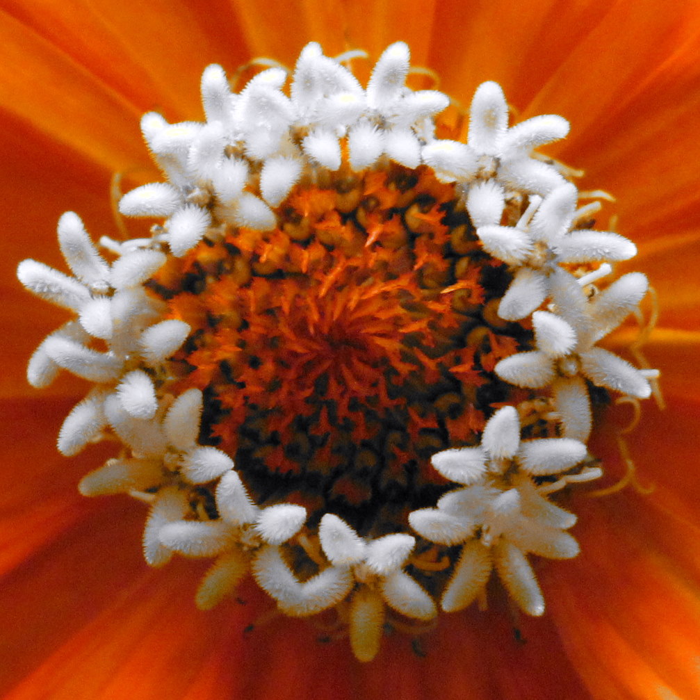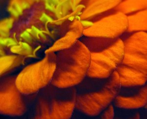The rains have been sucked up by very thirsty trees, flowers and lawn. This is a shot of one of the zinnias in the garden — a pretty fiery orange one.